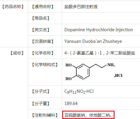 多巴胺注射液中含有的辅料为亚硫酸氢钠和依地酸二钠。